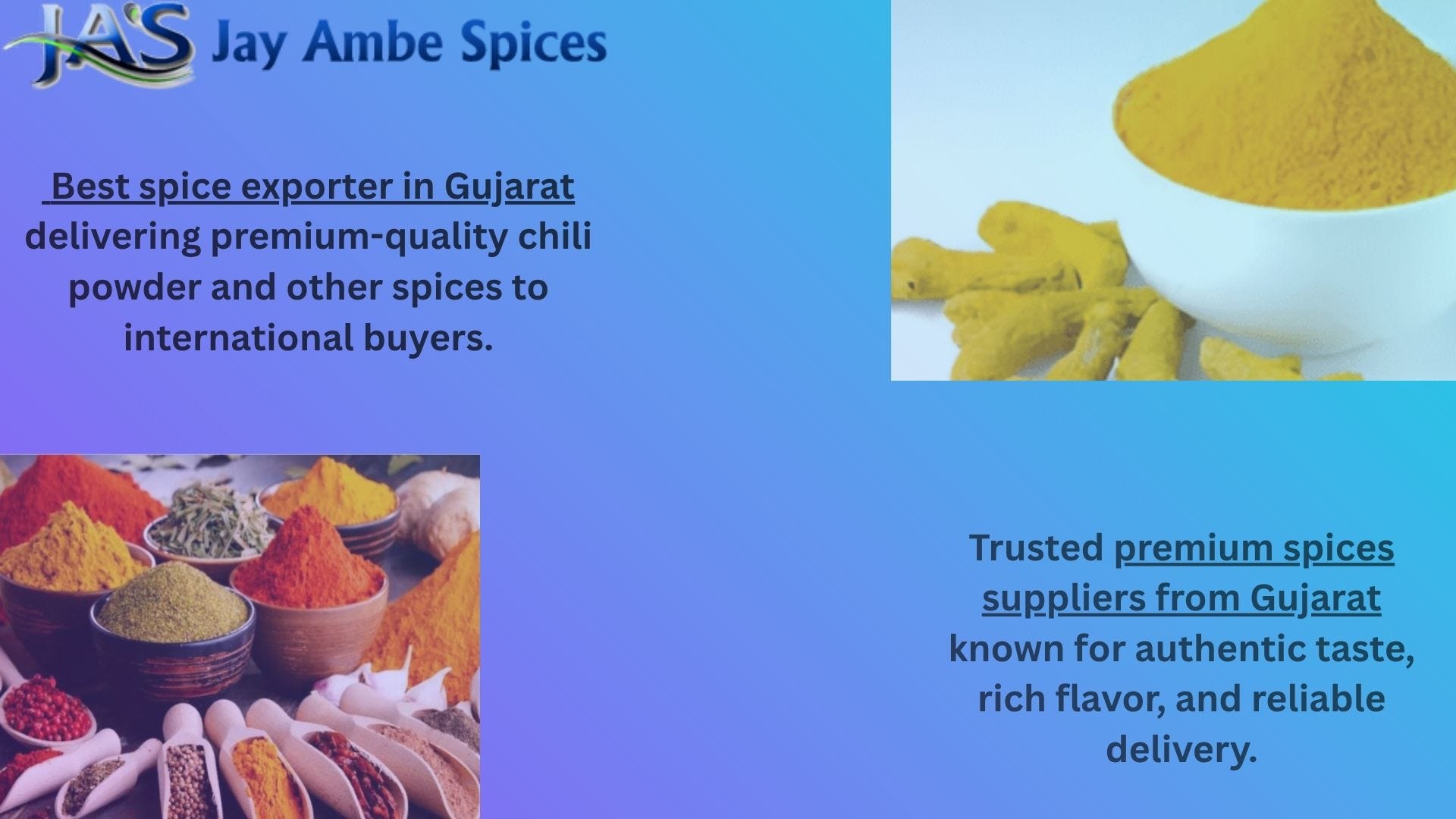 Jay Ambe Spices continues to set new standards as the Best Spice Exporter in Gujarat, ensuring every Indian home enjoys pure, flavorful, and healthy food. With 100% natural spice powders crafted with care and tradition, we are proud to represent the authentic taste of Gujarat — where quality meets heritage, and flavor meets trust.